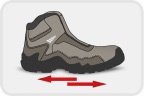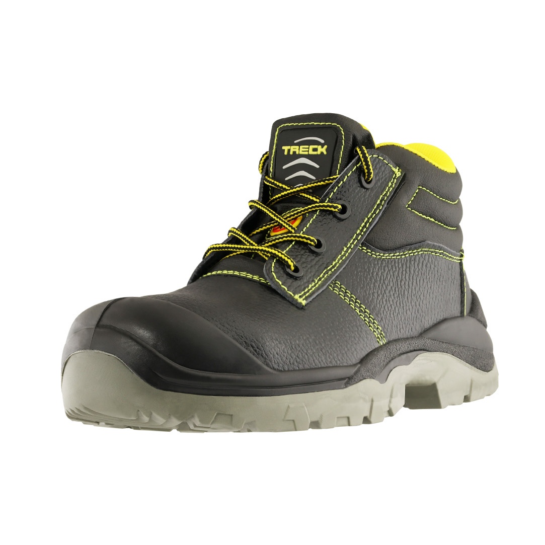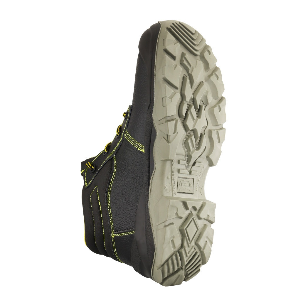 Incorpora puntera de acero Confort Toe Cap, planta bi-densidad antideslizante certificada EN ISO 20345:2022 SR, aislación eléctrica y plantilla de acero resistente a 1. 100 N, ofreciendo protección integral, durabilidad y comodidad durante la jornada laboral. ESPECIFICACIONES TÉCNICAS – Aparado: Cuero estampado negro de 1,8 a 2,2 mm de espesor, con resistencia al desgarro de 80 N/mm y tracción mayor a 2,5 kgF/mm². – Planta estándar: Poliuretano bi-densidad sistema poliéster con sobrepuntera de seguridad; resistente a ácidos e hidrocarburos, abrasión menor a 150 mm³, antideslizante según EN ISO 20345:2022 SR y con talón de absorción de impacto. – Plantilla acero: Resistencia a la penetración de 1. – Hilo de aparado: Nylon de alta resistencia títulos 20 y 40. – Cordones: Poliéster con resistencia mínima de 50 kgF. NORMAS Norma Americana Norma Europea EN ISO 20345:2022 SB E P FO SR F2412 (Aislante eléctrico) TECNOLOGÍAS TABLA DE TALLAS (CM) TALLA 36 37 38 39 40 41 42 43 44 45 46 CM 24 24,7 25,4 26 26,7 27,4 28 28,7 29,4 30 30,7 I