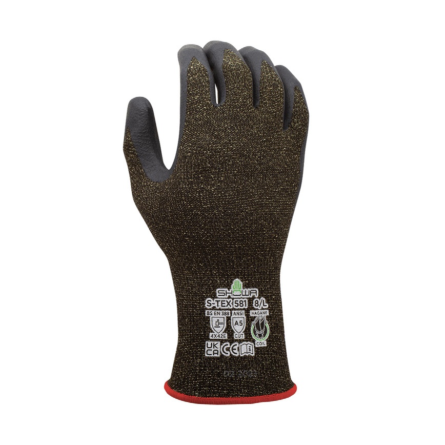 TALLAS S – M – L – XL – 2XL DESCRIPCIÓN Durabilidad y comodidad se combinan en el S-TEX 581, guante resistente al corte de SHOWA. CARACTERÍSTICAS – Resistente a los cortes – Peso ligero – Resistente al aceite – Recubrimiento – Agarre extra de nitrilo microporoso – Resistente a la abrasión – Revestimiento hecho – Transpirable con Kevlar® – Movimiento fácil – Ergonomía – Punto sin costuras – Reutilizable – Ajuste de forma APLICACIONES EN INDUSTRIAS – Automotriz – Construcción – Vidrios y Glaseado – Metalúrgico NORMAS CORTE ANSI/ISEA Cat