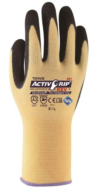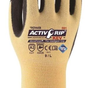 GUANTE TOWA KEVLAR NITRILO ACTIVGRIP KEV 591 . TALLAS S – M – L – XL DESCRIPCIÓN ActivGripTM Advance KEV TM combina la fibra Kevlar® con la tecnología MicroFinish® de Towa, brindando una excelente resistencia al corte y un excelente