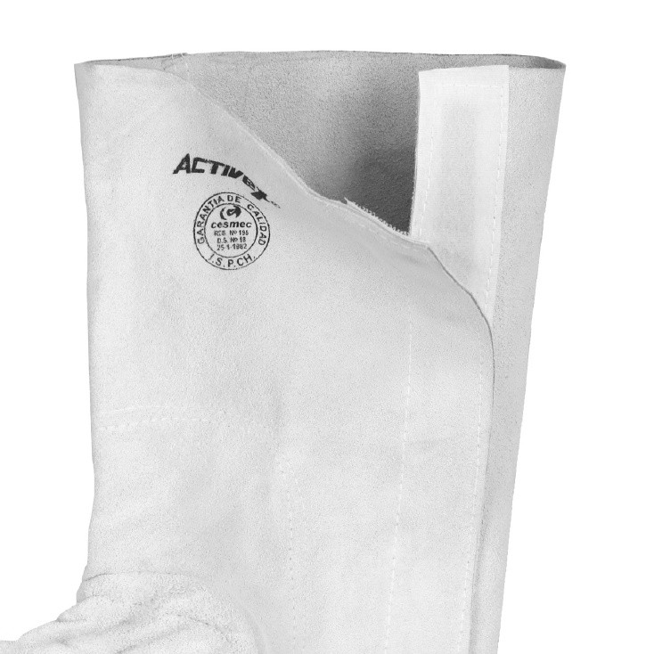 POLAINA ACTIVEX SOLDADOR DESCARNE CON VELCRO . TALLA ESTÁNDAR CARACTERÍSTICAS – Ropa de protección para soldador. – Fabricada en cuero flor de primera calidad. – Diseño técnico, costuras resistentes, paños completos sin costura. – Cierres velcro. – Color Cromo. NORMA